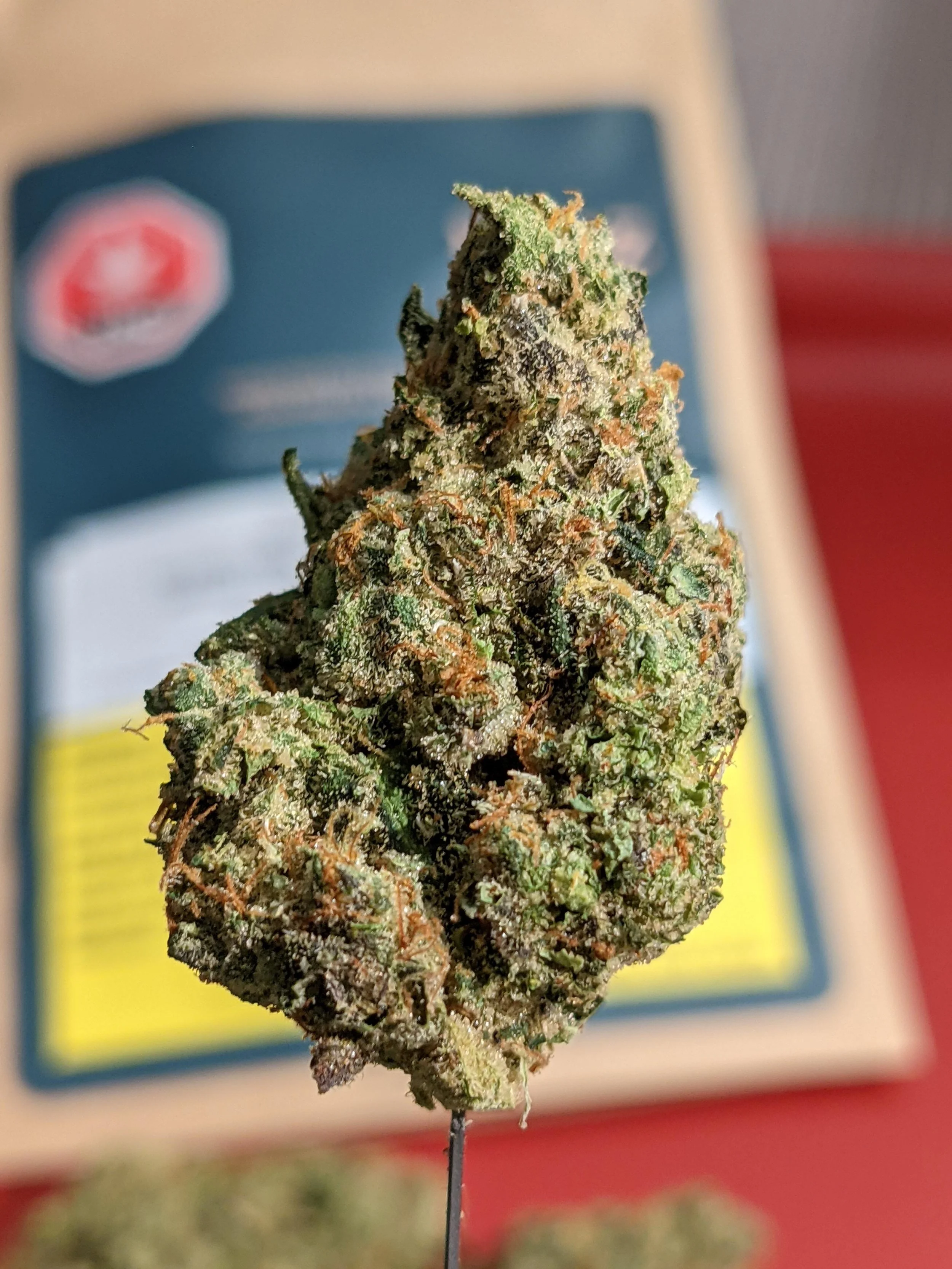 This handcrafted 50-50 hybrid strain is a cross of GMO Cookies x (Zktlz x OG Kush), with an aroma of onions, mushrooms, and garlic and a flavour that is earthy and peppery. The buds are tight, minty green with lilac undertones. Sparkling with dark orange hairs and a coating of lilac-tinted white crystal trichomes.